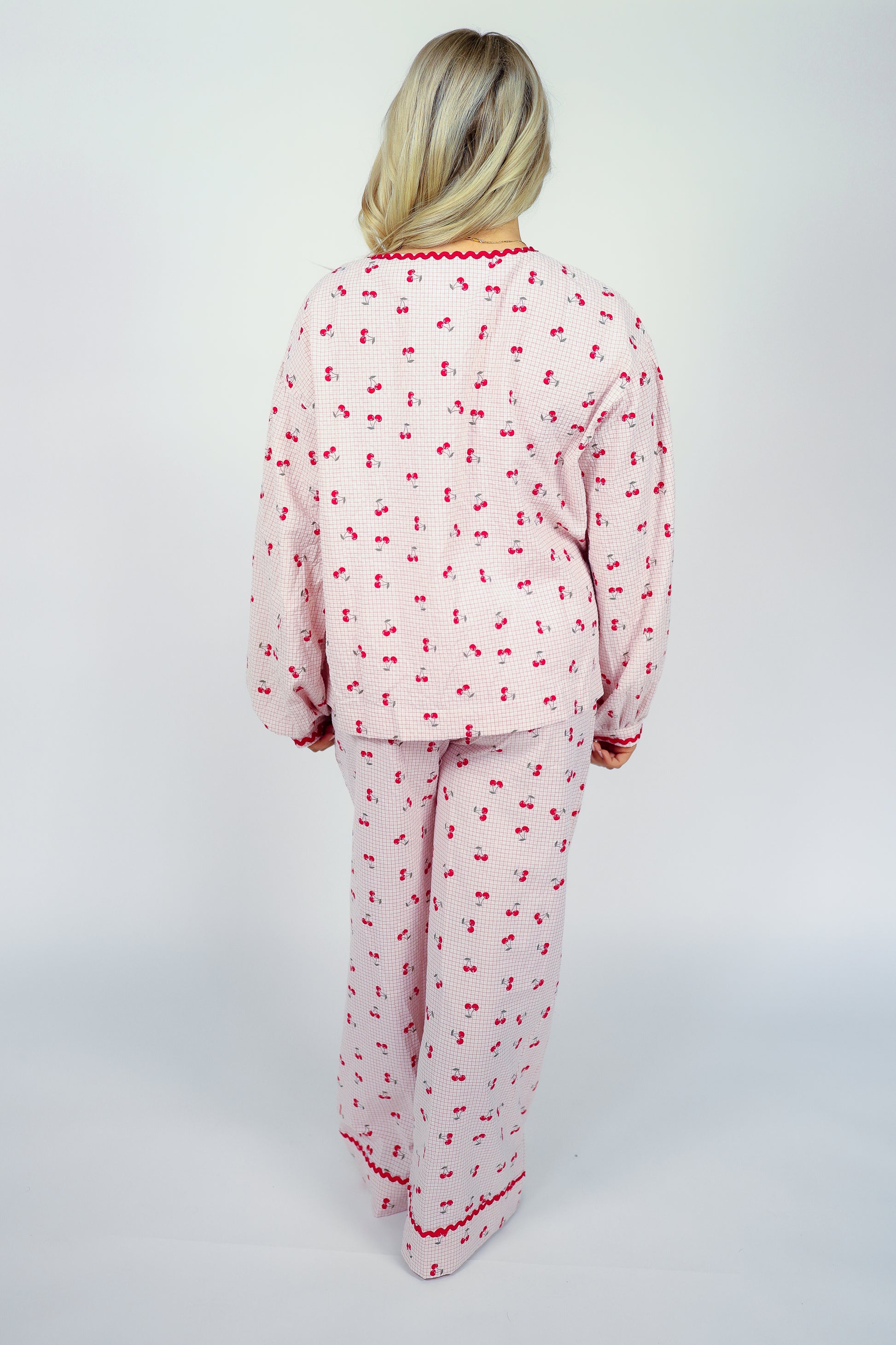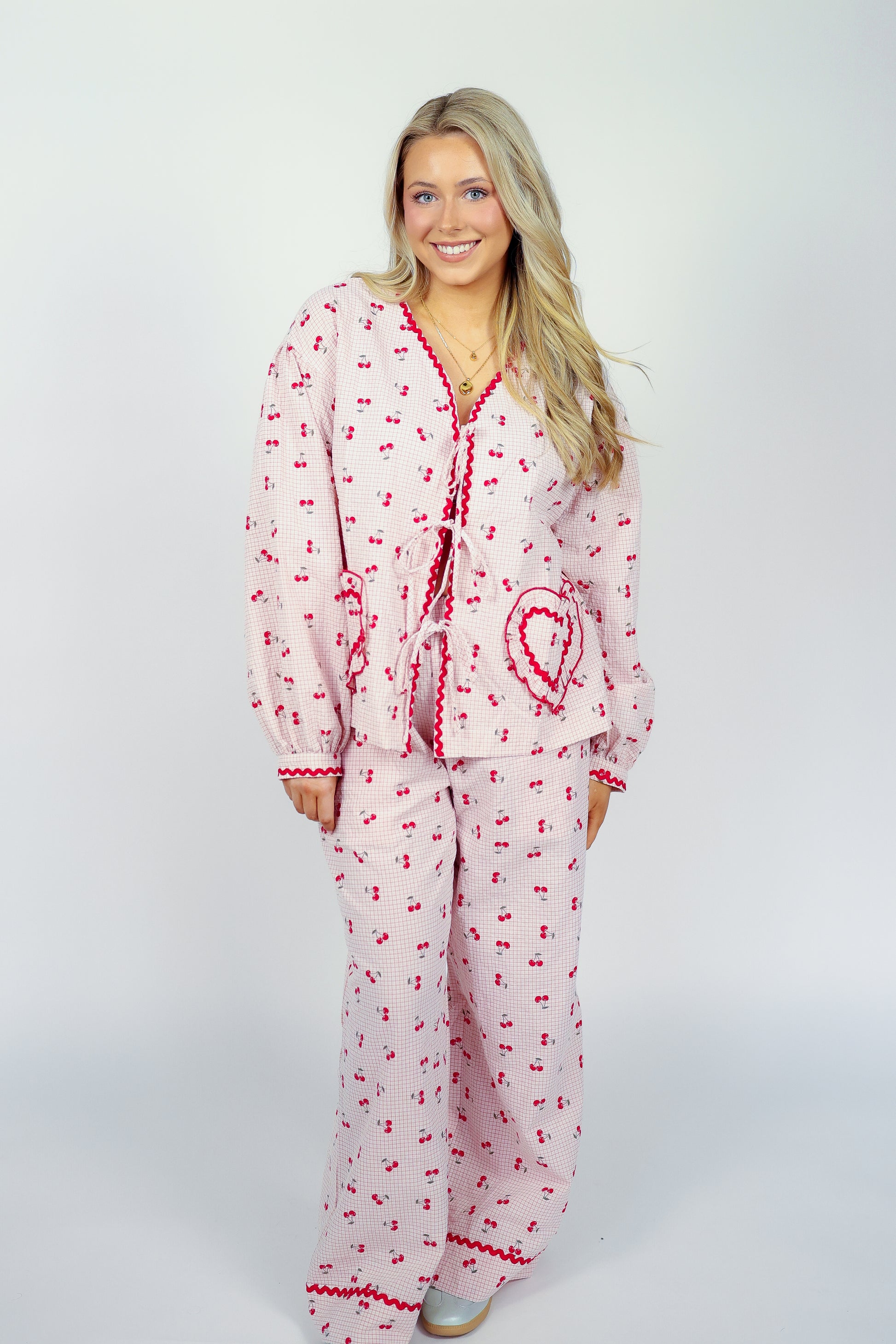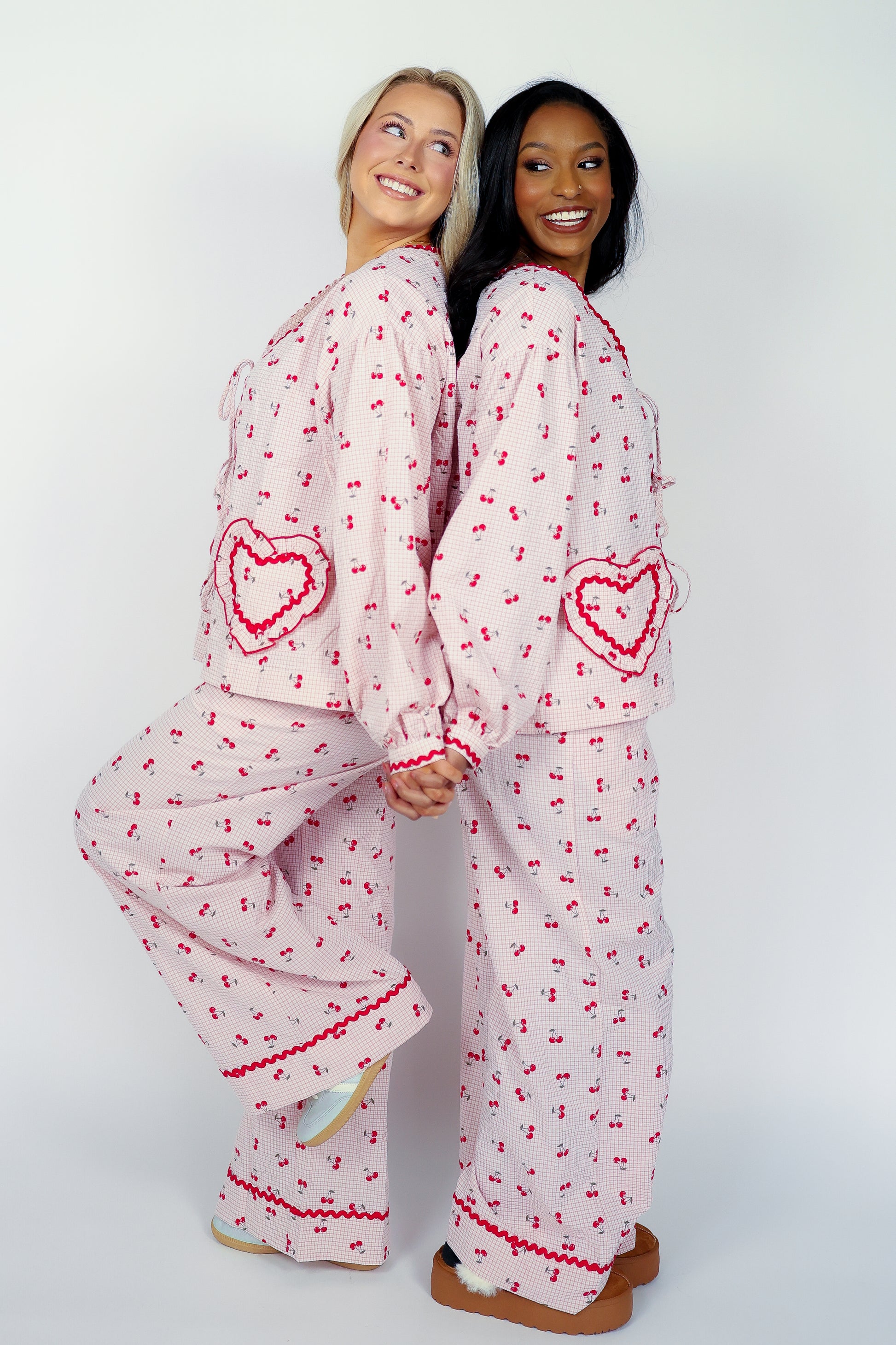 These are simply adorable! A cotton comfy pajama set with heart pockets and cherry detailing.