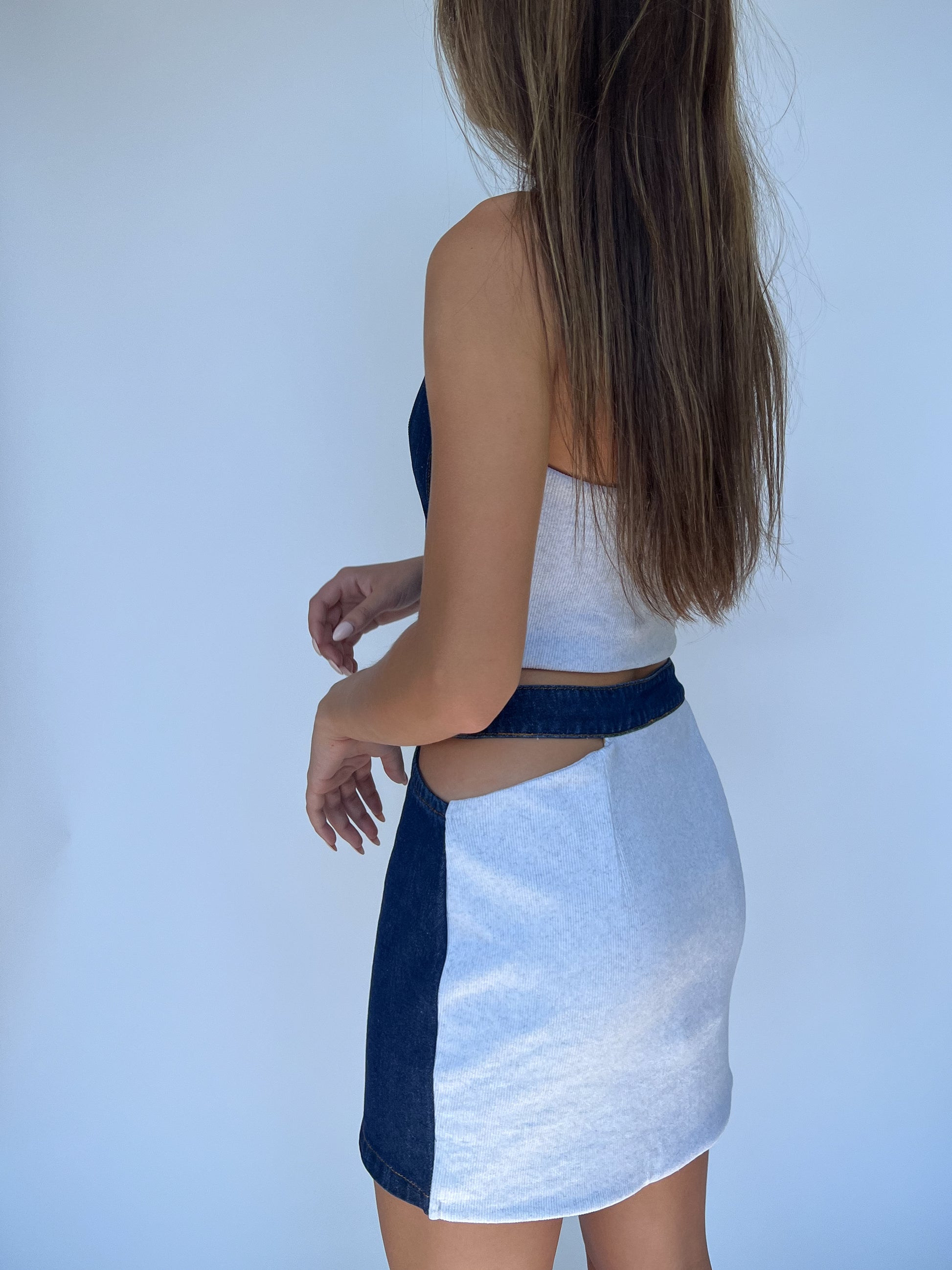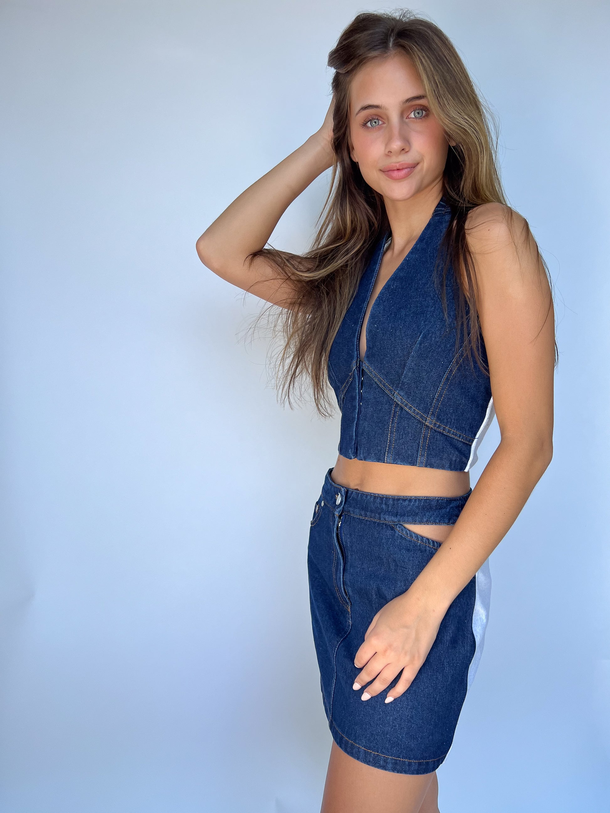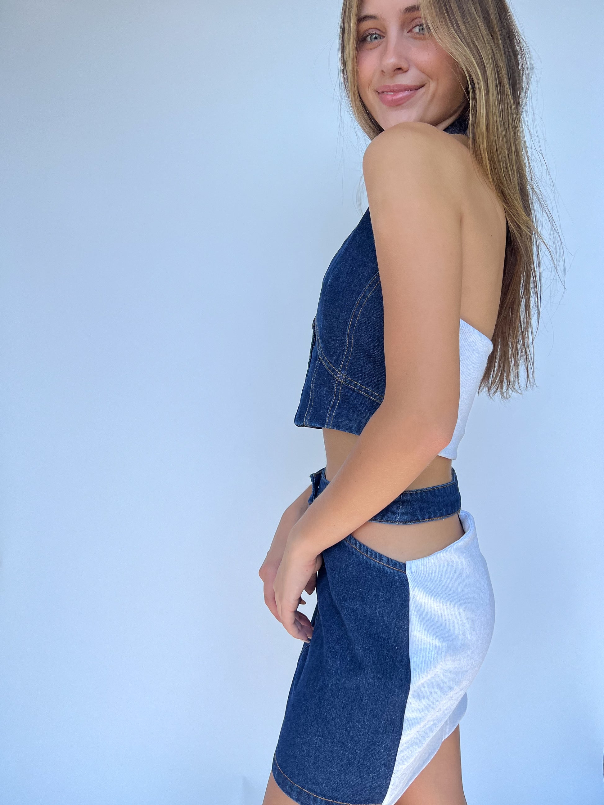 Be iconic in this amazing set! Denim front with super comfy stretch back, will make them all double take! Eyelet closure on from or top and a fun cutout on the waist of the skirt. Top and Skirt are included in the set.