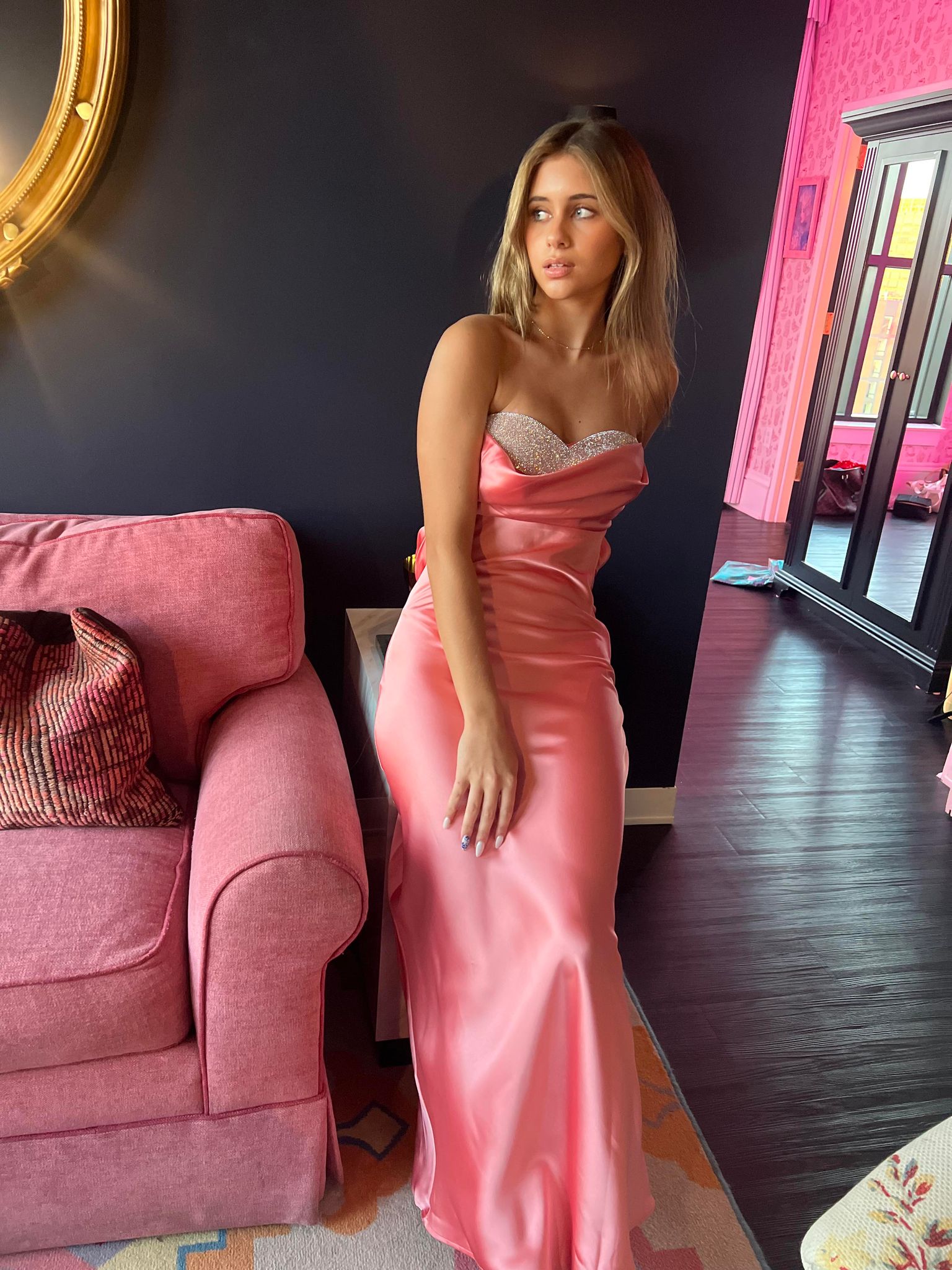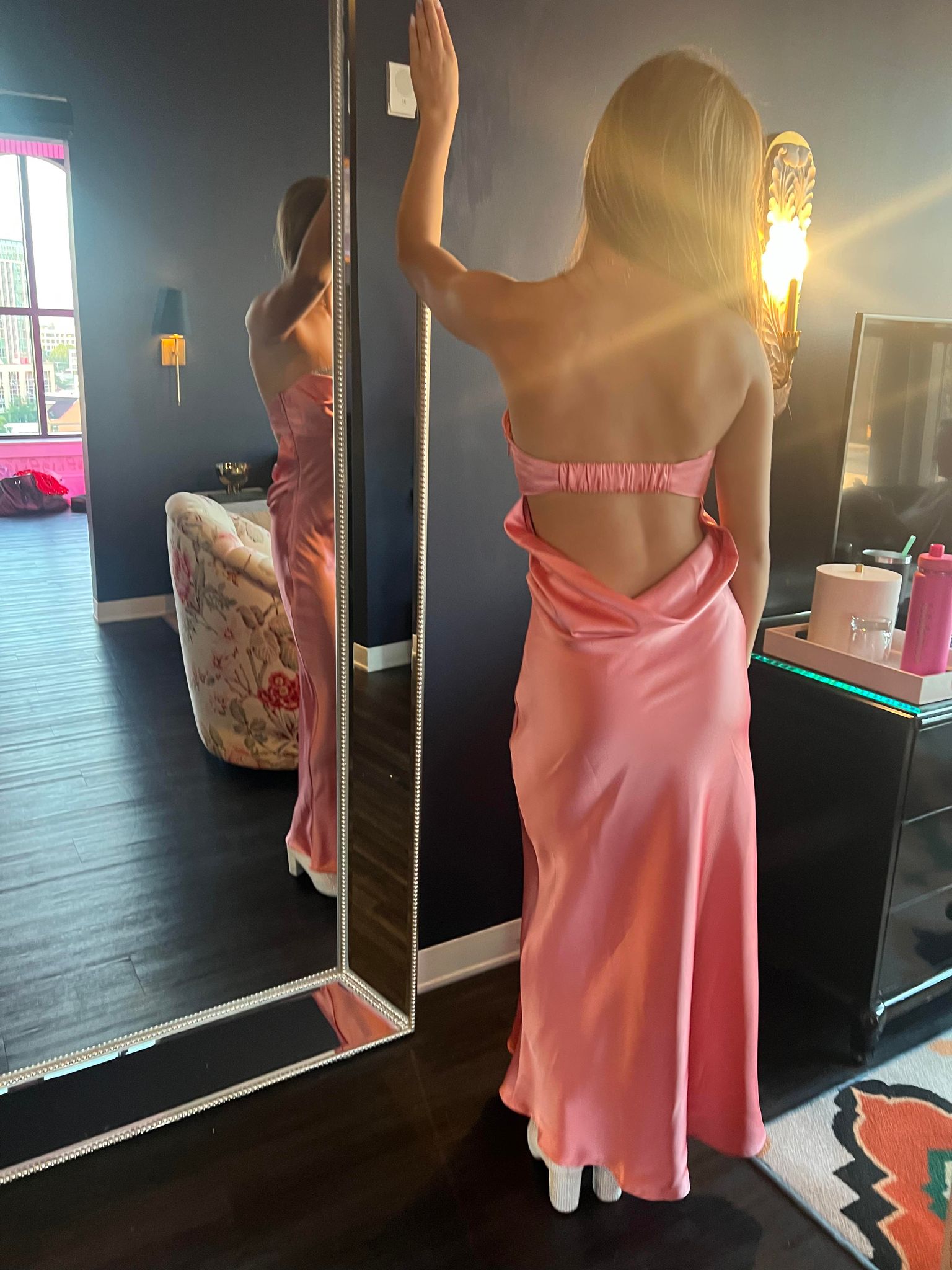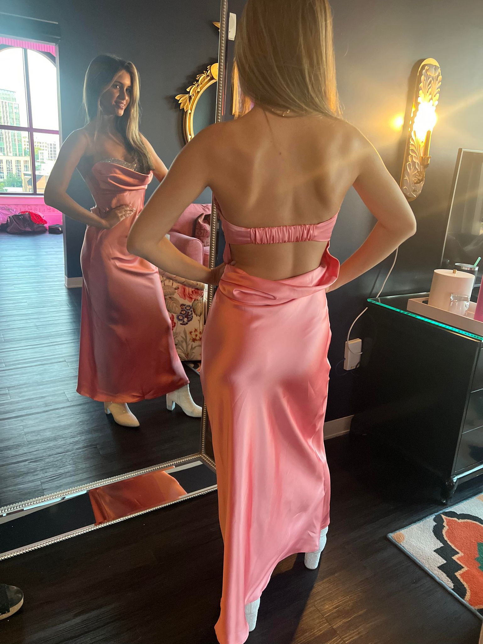 Introducing the Fallon Dress - designed to make you sparkle and shine! This Peach midi dress features amazing rhinestone detail, plus an eye-catching flounce back to help make a statement. Perfect for any special occasion when you've got to dress to impress!