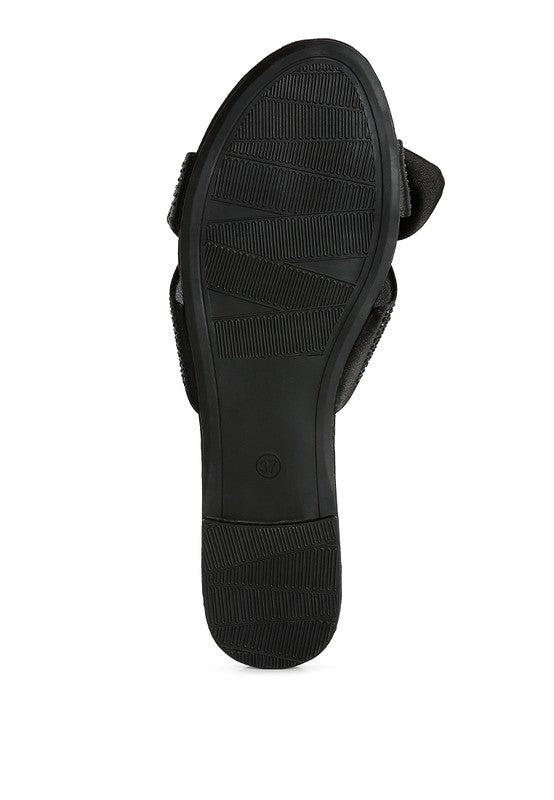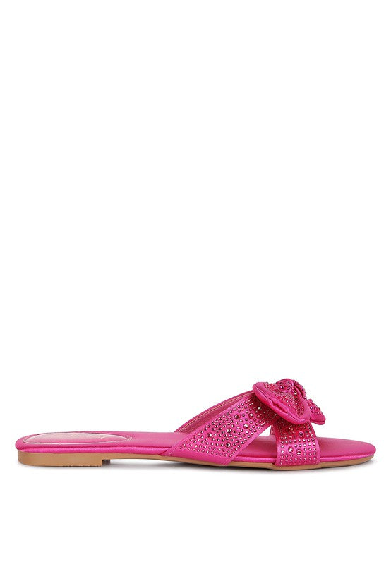 'FLEURETTE' is romantic poetry that conveys allure and elegance through vogue. The bow structure on the front adds an elegant and posh element with the scattered diamante which speaks of opulence. The flat sandals have an easy-to-wear slip-on construction which is chic and comfortable.