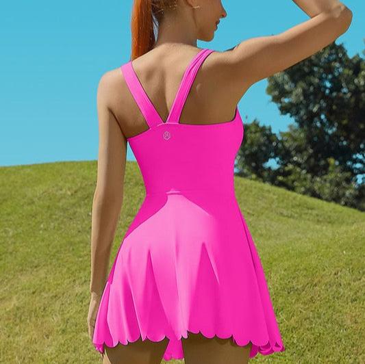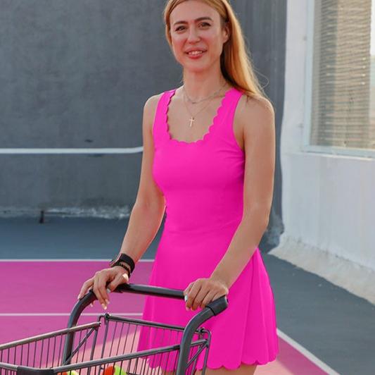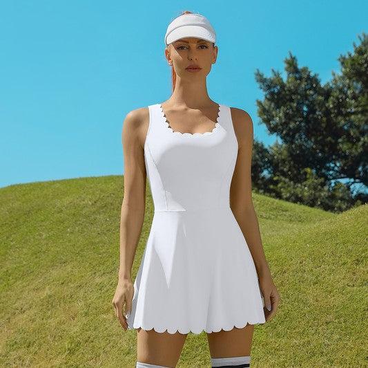 Hit the courts or course in this adorable athleisure dress! Scallop details, stretch fabric, fun back detail and separate shorts with 2 pockets make it the perfect addition to your workout style!